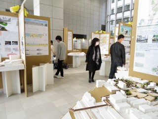 変更された会場となった1号館1階のプレゼンロビーは、普段は全学学生の自習や待合せの場として椅子と机と植栽の並ぶ空間です。