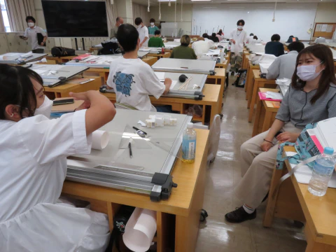 グループ別エスキースも、いくつかのグループは製図室での作業に替え、先生が製図室内を廻ってアドバイスされるような運用となり、コロナ以前の製図室だけでの設計演習のような雰囲気がより強くなってきました。