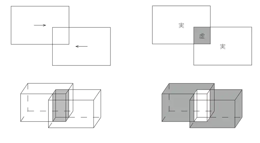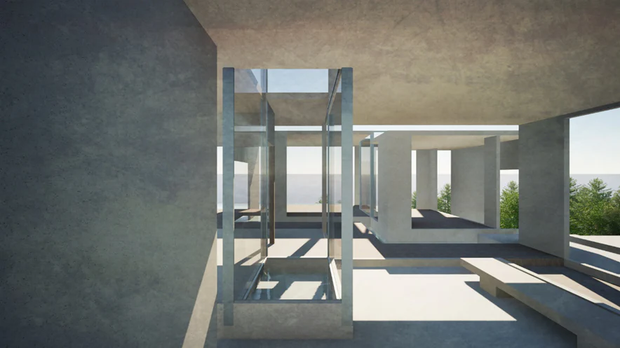 日本建築をそのまま建てるのではなく、「静の空間としての要素を抽出し、現代建築やこれからの建築に応用することで、歴史的建築に限らず鎮まる場をつくることができると考えました。その要素として、虚と実の概念、そしてそれらが互いに絡み合うように減算、雁行形、境界の曖昧さ、所作を取り入れました。心の拠り所や想いを投影するため、建築内で重なった曖昧な空間を虚の空間とし、干渉できない「虚」をつくりました。「虚」には、薄く水を張り、水面の動きや光が人々の心の拠り所となり、想いや祈りの対象となります。